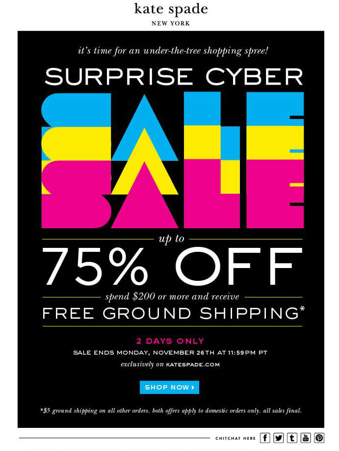 Create a sense of urgency in your Cyber Monday deals that make customers want to buy the items immediately. For instance, you can send your customers an email with a 60% discount, which will last for the next 2 hours. Alternatively, you could send out emails every 2 hours with a new deal or an extra freebie. Promote these 2-hour deals on your social media channels as well.